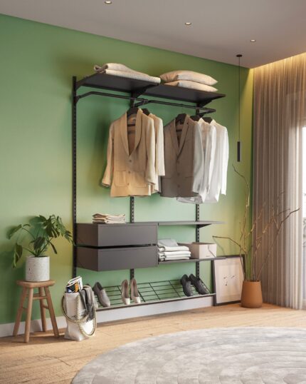 O grande diferencial deste closet modular está na sua estrutura aberta, que favorece a ventilação natural e evita o acúmulo de mofo e odores. Ideal para ambientes úmidos ou com pouca circulação de ar, ele garante que suas peças permaneçam sempre frescas, bem cuidadas e prontas para o uso — sem surpresas desagradáveis.