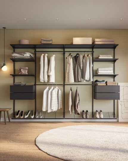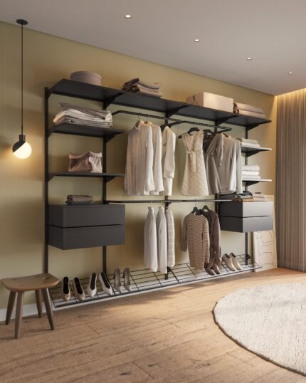 Este closet modular protege suas roupas e valoriza o seu espaço.